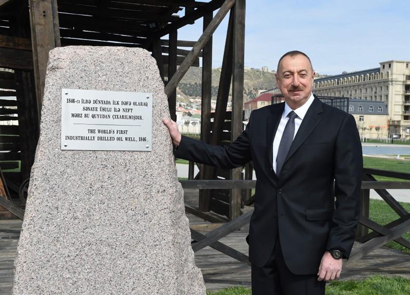 Azerbaijan President Ilham Aliyev near the restored oldest well at Bibi-Heybat (April 26, 2017)