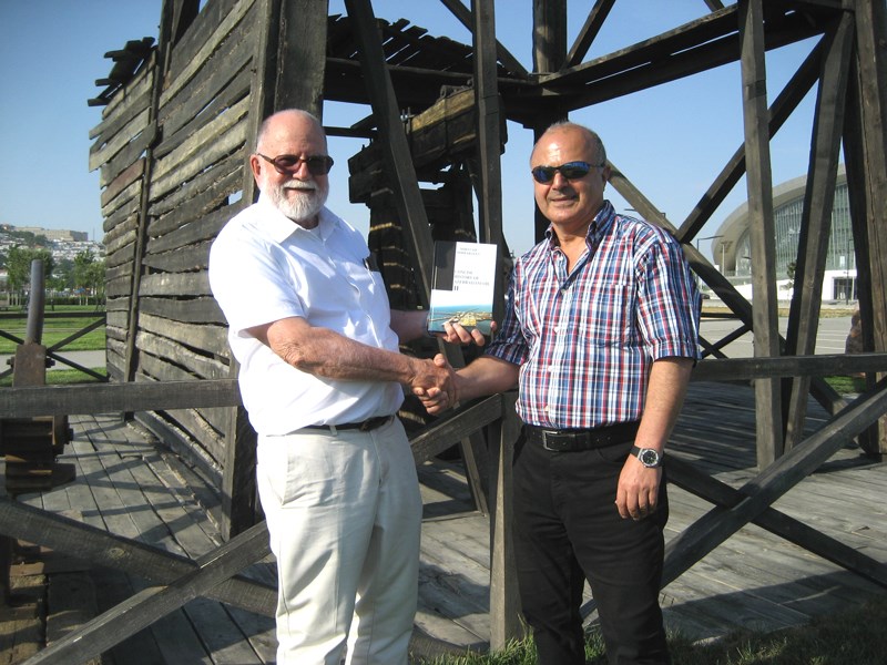 The author with Bill Brice at the 1846 well site in Baku in June 2018, holding a copy of Mir-Yusif’s book, “Concise History of Azerbaijani Oil”