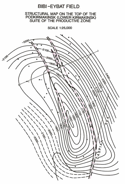 Although this first well was drilled in 1846, the official date of the discovery of the Bibi-Heybat field is 1871. In the modern sense, the beginning of the large-scale oil industry in Azerbaijan is considered to be 1871, for that is the year when the Bibi-Heybat, Balakhani, Sabunchi and Romani fields were discovered near Baku. Oil production has continued since that time. By 1872, the legal basis for the exploitation of oil fields began to form when two legislative acts were adopted: “The Law on Oil Fields and the Collection of Excise Taxes on Oil Products” and “The Law on the Auction Sale to Private Persons of Oil Fields in the Hands of Tenants.” At the first oil auction at the end of 1872, 17 plots were sold at Bibi-Heybat and Balakhani (Baku villages). Bibi-Heybat saw its first gusher six years later. The field produces from several Pliocene sandstone reservoirs on what we now know to be a giant faulted anticline.