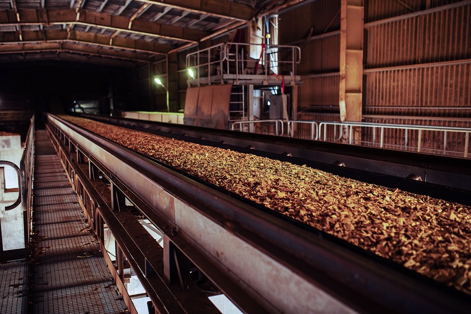 Wood processing plant transports wood chips on a conveyor belt. Bigstock
