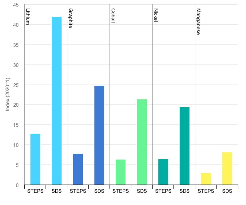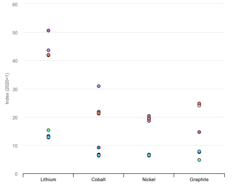 Growth in demand for selected battery related minerals from clean energy technologies in 2040 relativeto 2020 levels by scenario.