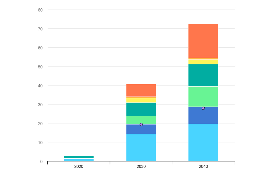Annual electric car sales in the sustainabledevelopment scenario 2020-2040.
