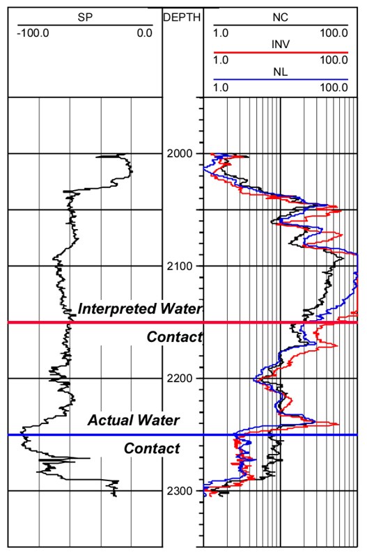 During initial development, the reservoir model can be oversimplified. In this large gas field, the porosity in the field was constant so it was assumed that the reservoir properties areconstant. The resistivity logs were assumed to be a proxy for water saturation. The dropping resistivity values were interpreted as a transition zone, and the field contact was located at thered line. What wasn’t realized until after the field had been on production for 20 years was that the changing resistivity did not indicate a water contact but changing reservoir properties.The actual contact was more than 100 meters deeper, and the field extended further down dip significantly increasing the hydrocarbons in place and modifying the development strategy.