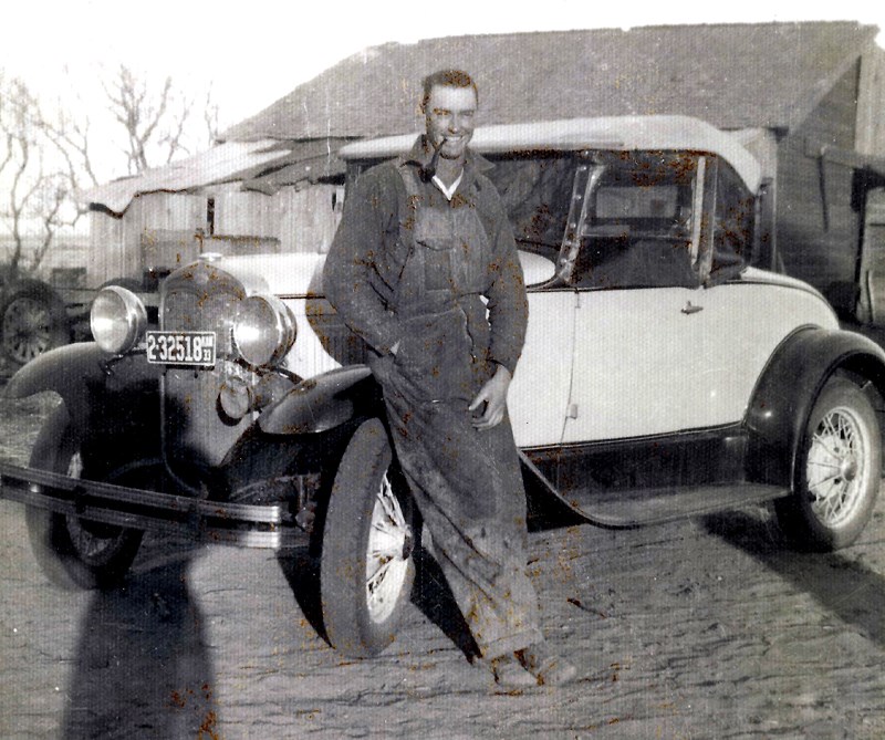 Albert Harris in construction work clothes with his 1929 Chevrolet Roadster, 1933