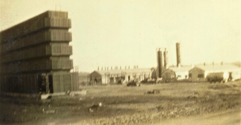 Albert's main work yard from Lease House yardshowing Gerber No. 1 derrick; see FitzsimmonsNo. 1 derrick in distance.