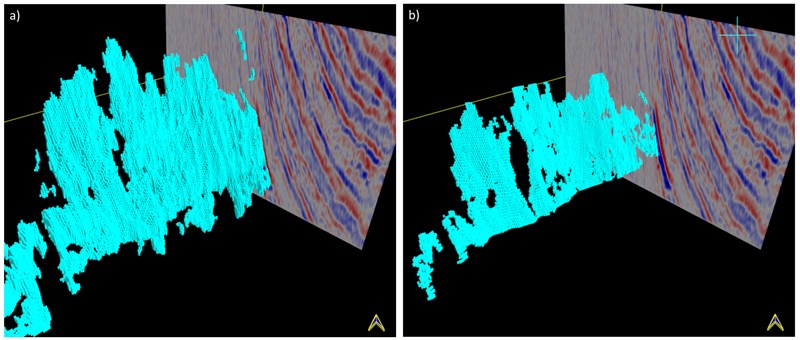 Figure 2: A perspective view of the inline section from the 3-D seismic volume shown in figure 1 intersected with the (a) cyan geobody pickedfrom the envelope attribute only, (b) cyan geobody picked from the use of relative acoustic impedance, instantaneous envelope, and iso-frequency(20 hertz) attribute volumes. The geobody picked seems to have been refined somewhat with a smaller volume. Data courtesy of the U.S. Geological Survey.