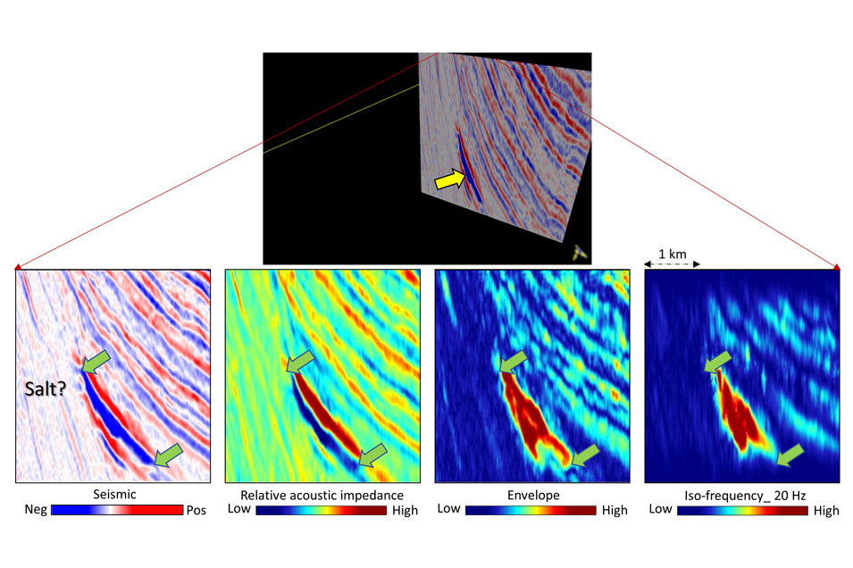 T he September 2021 Geophysical Corner was an article entitled ‘3-D Visualization and Geobody Picking of Amplitude Anomalies in Deepwater Seismic Data,’ in which we reviewed the use of geobody tools to rapidly visualize the extent of geologic features that give rise to a strong seismic amplitude response. In that example, the highlighted strong amplitude anomalies corresponded to turbidite channels and fans, mass transport deposits and current-generated bars. Figure 1 shows a steeply dipping high amplitude anomaly against a salt diapir in a survey acquired in the deepwater East Breaks Alaminos Canyon area of the western U.S. Gulf of Mexico. For seismically thin reservoirs, the response of a gas-saturated sandstone gives rise to a trough at the top and a peak at the base. In this case, we would need to select two separate geobodies to map the reservoir. In contrast, we showed in our September 2021 article that the instantaneous envelope attribute allows the interpreter to pick a single geobody to represent the anomalous feature.