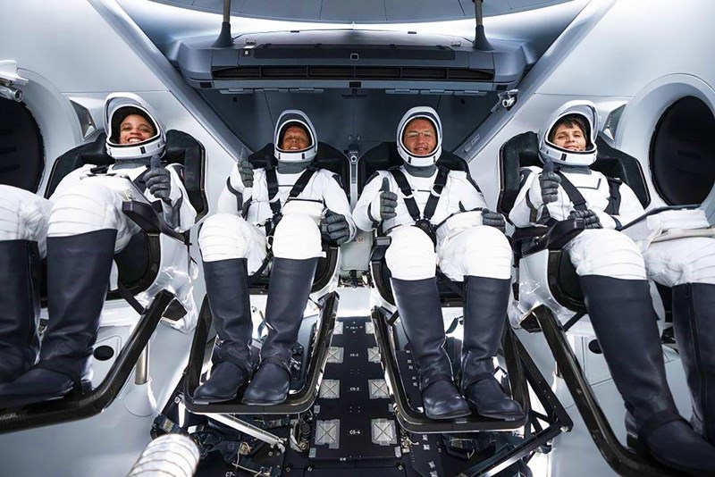 SpaceX Dragon Crew 4, from left: NASA astronauts Jessica Watkins, Bob Hines, Kjell Lindgren and ESA astronaut Samantha Cristoforetti arrived at theISS on April 27, 2022, flying 261 miles above the Pacific Ocean. The crew is expected to return to Earth in September 2022.