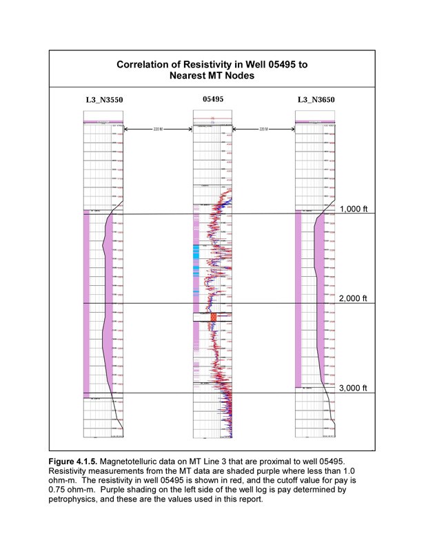 Magnetotelluric data on MT Line 3 that areproximal to well 05495. Tesistivity measurementsfrom the MT data are shaded purple where lessthan 1.0 ohm-m. The resistivity in well 05495 isshown in red, and the cutoff value for pay is 0.75ohm-m. Purple shading on the left side of the welllog is pay determinded by petrophysics, and theseare the values used in this report.