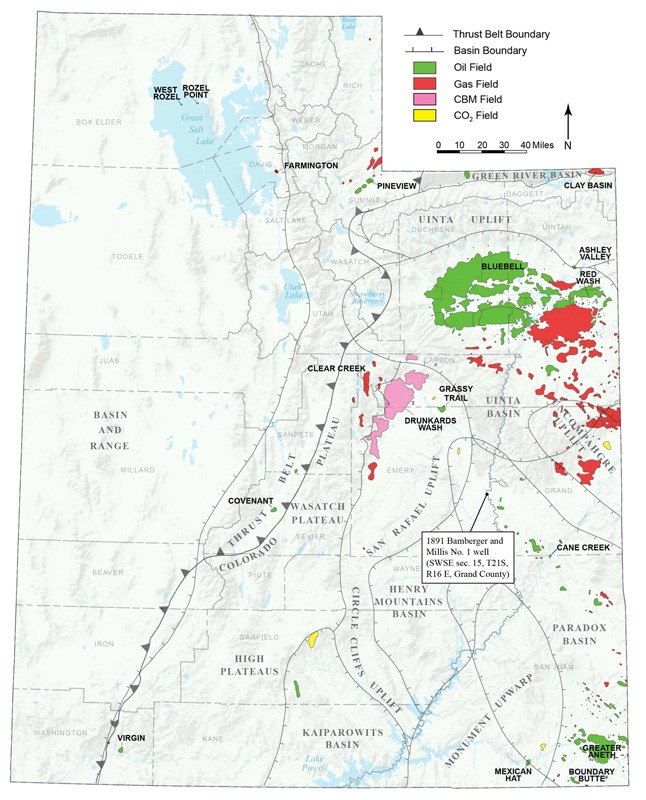 Oil and gas fields map of Utah. Fields discussed in detail are labeled. Note the location of the 1891 Bamberger and Millis No. 1 wildcat.Modified from Wood and Chidsey (2015).
