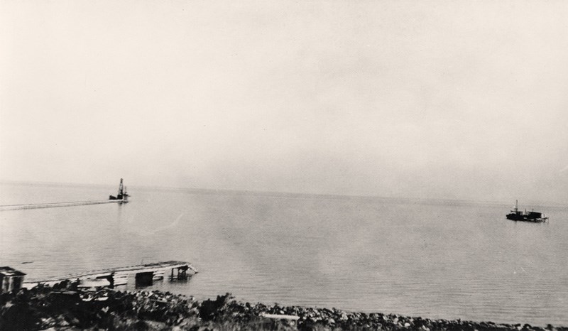 Natural oil seep at low lake level of Great Salt Lake, Rozel Point area, circa 1937.