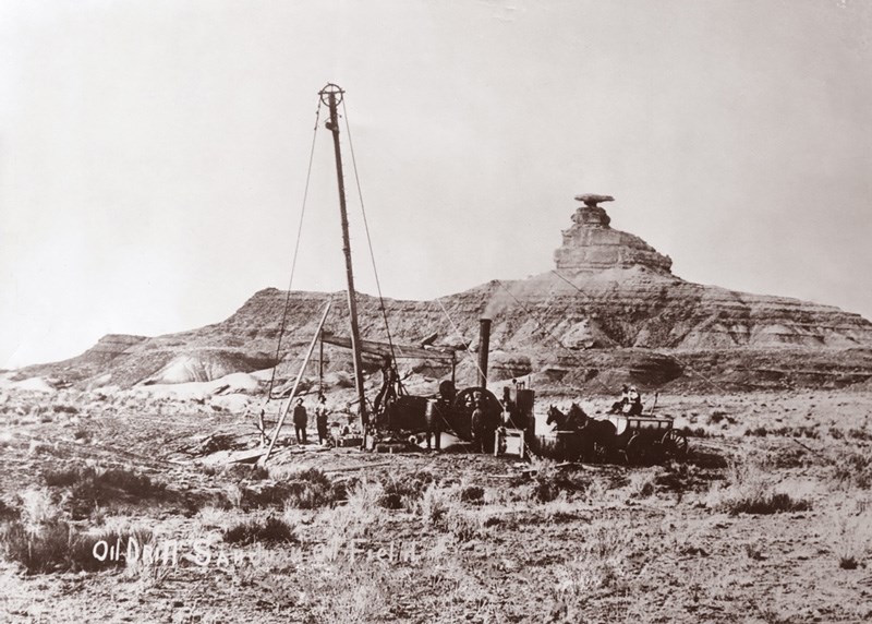 Cable tool drilling near Mexican Hat Rock, circa 1920.
