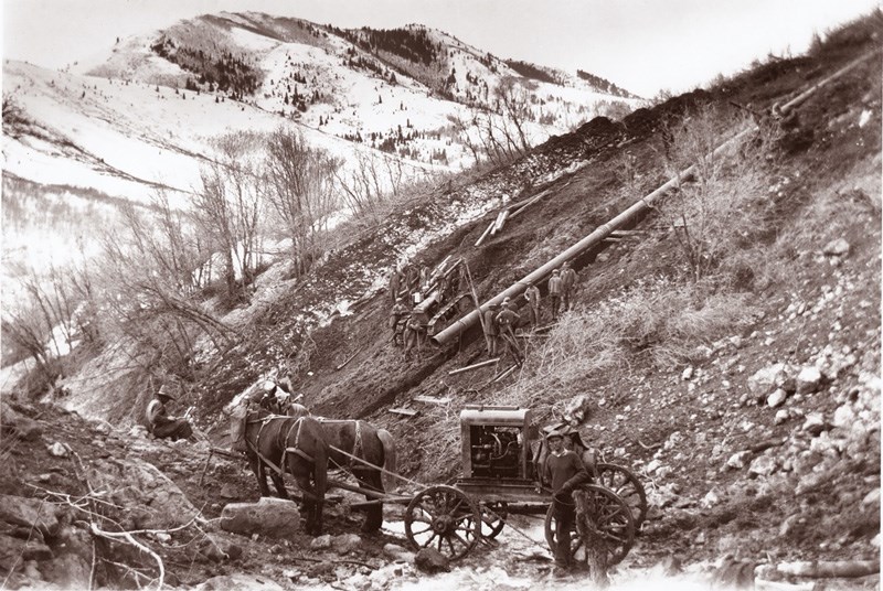 Pipeline construction through the Wasatch Range, northern Utah, circa 1930.