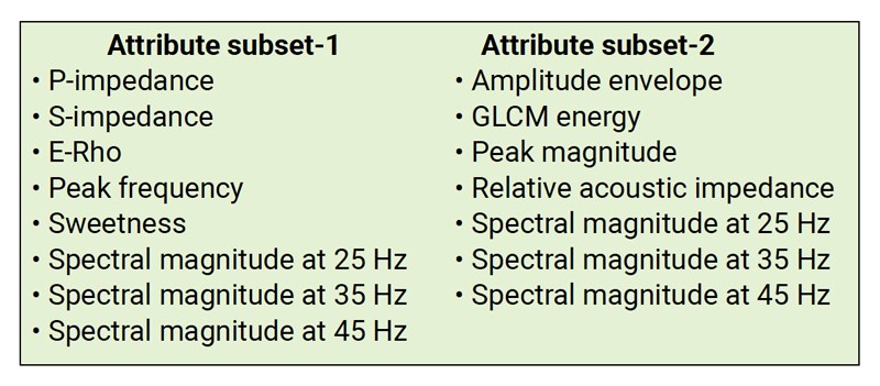 The choice was made for these attributes for the second set in view of the fact that, quite often, the absolute impedance inversion may not form a part of a project. In such cases the relative acoustic impedance could be used as one of the input attributes. We retained the three spectral magnitude attributes at 25, 35 and 45 hertz in attribute set-1, replaced the sweetness attribute with amplitude envelope, the peak frequency with peak magnitude and brought in GLCM energy. This combination is different but has a bit of an overlap.
