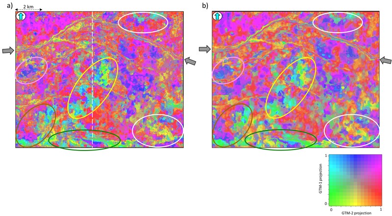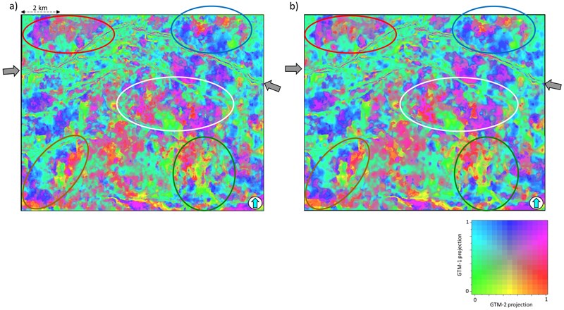 Even though all seismic attributes were computed on preconditioned input seismic data, parts of the GTM displays appear as noisy (as seen within the white and brown polygons in figure 3a and red and green polygons in figure 4a).