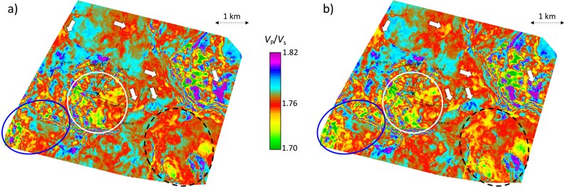 Figure 4: Horizon slice at the ‘Top of Hugin’ formation extracted from the VP/VS volume computed from the (a) first pass of simultaneous inversion, and (b) second pass of simultaneous inversion run with updated LFM.Notice the variations in terms of VP/VS as indicated with white block arrows as well as the white ellipse on both displays. Data courtesy of Equinor and partners.