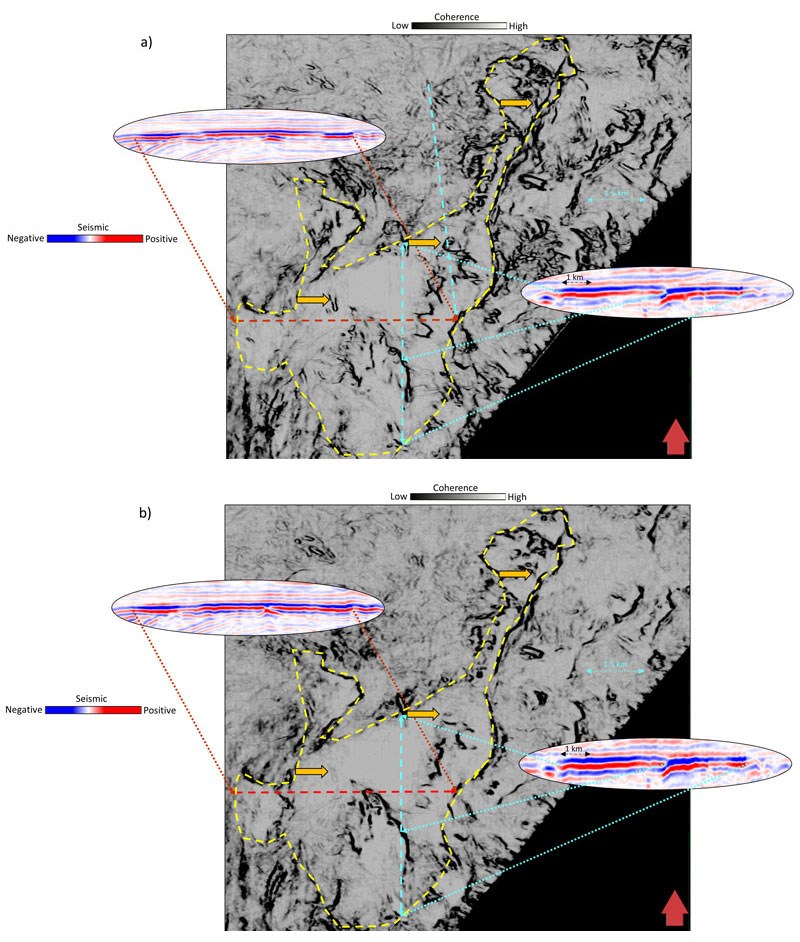 The lateral changes in amplitude are often accompanied by a lateral change in phase. For this reason, the coherence images computed from the near- and far-angle stacks can be different. Often, the presence of gas will be sufficiently strong to mask smaller lateral changes in lithology, resulting in the high coherence anomaly seen inside the yellow polygon in figure 2b. In contrast, the edges of the gas anomaly itself are stronger on the coherence computed from the far-angle stack. (More detail on multispectral coherence can be found in the July 2018 installment of Geophysical Corner.) A comparison of the seismic amplitude signatures in the insets along the indicated directions on the coherence display shows the edges of the gas-charged zone on the far-angle stack to be not only stronger, but with better defined breaks in spite of the reduced vertical resolution. Integrating these two attributes (the change in amplitude between the near- and far-angle stacks and coherence) with geometries consistent with a geologic model of deepwater deposition further confirms the hypothesis of a gas-charged sand.