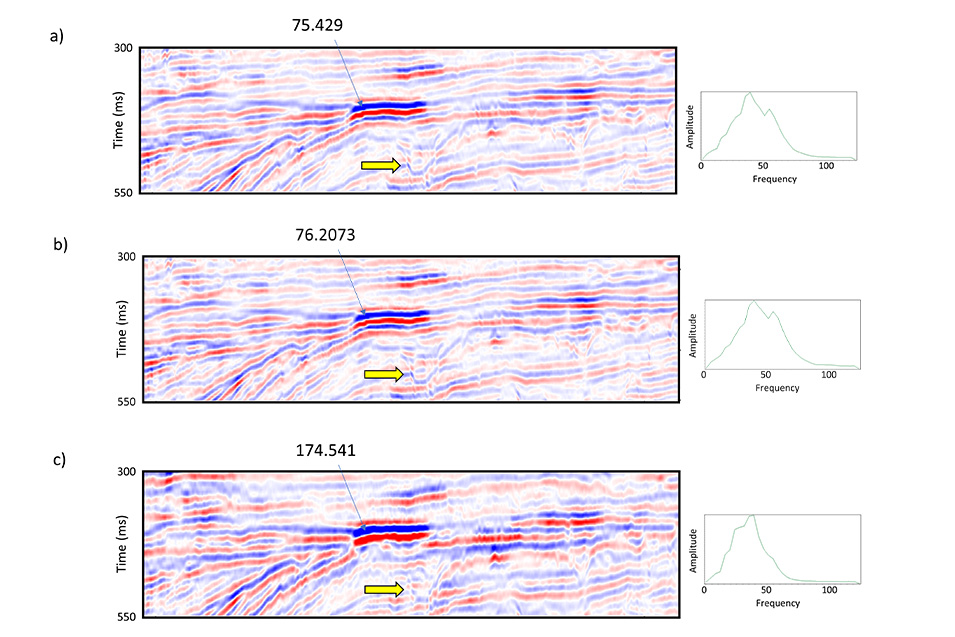 In addition to slope and intercept, the angle-limited stacks themselves provide complementary images of the subsurface. In general, the near-angle stack will provide greater vertical resolution and, depending on the subsurface impedances, illuminate features poorly imaged by the far-angle stacks, such as the incised channel indicated by the yellow arrow in figure 1. Low impedance gas sands encased within higher impedance shales will usually show a brightening of amplitudes with angle of incidence. Such anomalies can be readily detected by simply animating between vertical or horizon slices through the near- and far-angle stacks, which can provide a quick indication of potential targets meriting more detailed AVO analysis and petrophysical modeling.