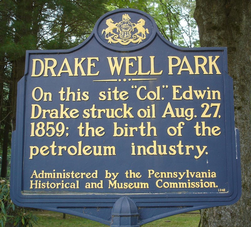 Historical plaque at the Drake Well Park in Titusville, Penn. Photo by the author.
