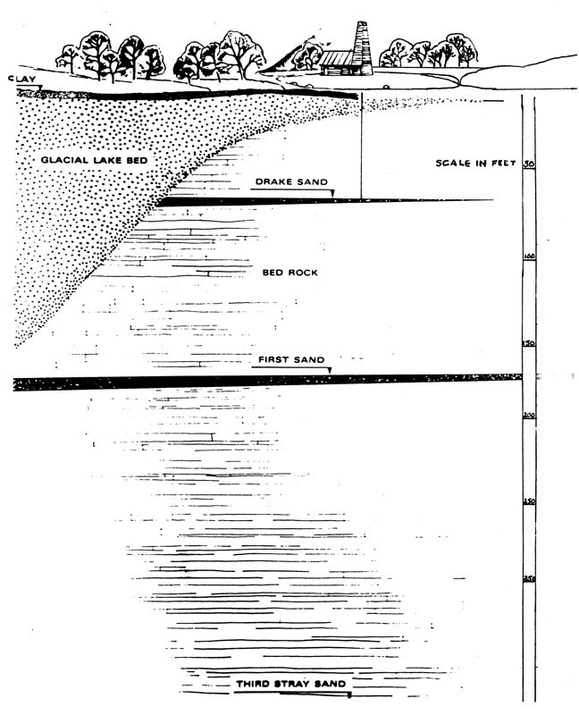 However, what Drake did not know, and had no way of knowing at that time, was that the drilling had struck a small sandstone lens, now called the Drake Sand, at 69 and a half feet. If he had selected a site only a few tens of feet in almost any direction, he would have missed this small lens. The next oil-bearing horizon, which was more than 100 feet lower, would have required much more drilling. But by then the letter from New Haven would have arrived telling them to close up shop – there would have been no Drake Well, and someone else might have drilled the well to kick off the Age of Petroleum.