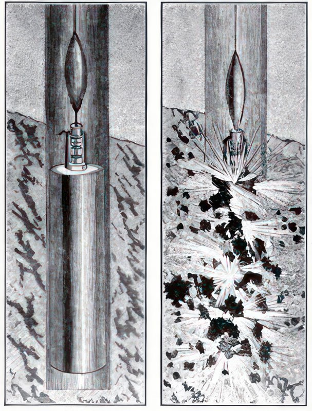 Several wells in the area had been rejuvenated by the new process of using a “torpedo.” This process simply utilized a tall thin tube, filled it with nitroglycerine and then lowered the torpedo down the hole. It had only recently been patented by Colonel Edward A. L. Roberts. Often the well casing was filled with water to help concentrate the explosive force. Once the tube was in place, a crew member would drop a weight called the “go-devil” down the hole, and “go like the devil” to get off the platform before the weight hit the blasting cap on top of the nitro-filled tube. The subsequent explosion then fractured the surrounding rock which, most of the time, allowed the oil to flow more freely. Sometimes productivity was increased up to 1,200 percent. (And sometimes the explosion was premature and workers were killed.) The process was known as “shooting the well,” and it was a precursor of modern hydraulic fracturing.