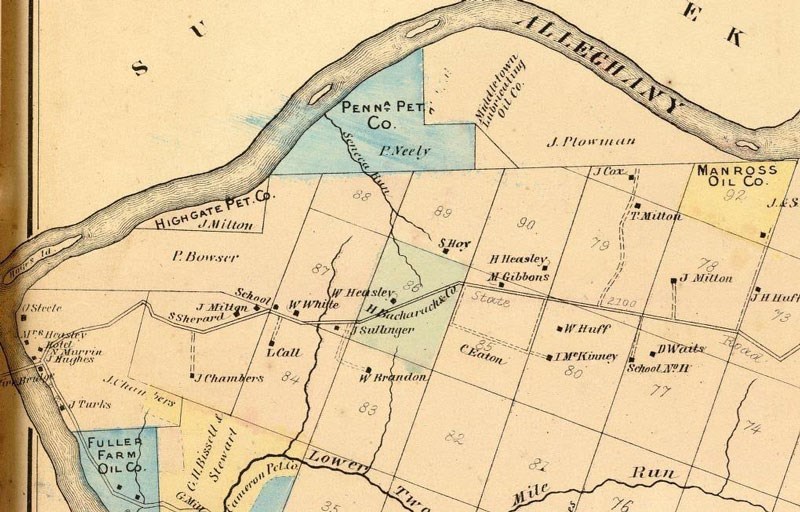 Map showing the 3.5-acre Fuller Farm along the Allegheny River, the location of the drilling in 1864. Courtesy of the American Oil and Gas Historical Society.