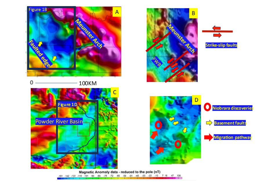 Figures 1C and 1D show a comparison between regional magnetic and HRAM surveys of the southern portion of the Powder River Basin in Colorado. The HRAM image shows the unique structural position of two major Niobrara discovery wells that were recently developed in this area by horizontal drilling. The two wells appear to be formed along the downthrown side of several basement faults that have been charged by the migration of oil from the south.