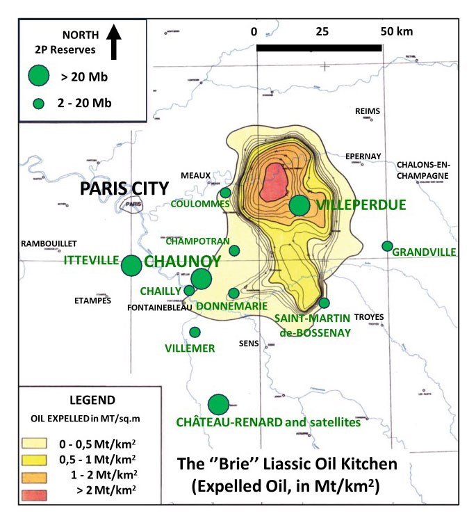 The source rock kitchen extends into the depocenter of the Brie area. Carboniferous layers are marginal sources in the Trois-Fontaines Muschelkalk gas field (where Storengy is the current operator) and the Forcelles Lettenkohle oil field (Replor, current operator).