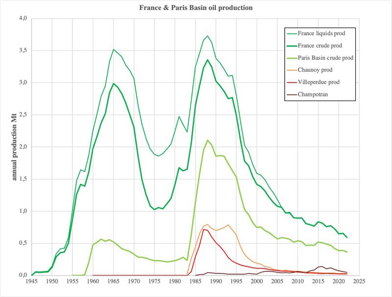 Oil production statistics of the Paris Basin, sources Bureau Exploration-Production des Hydrocarbures and Comité Professionnel du Pétrole