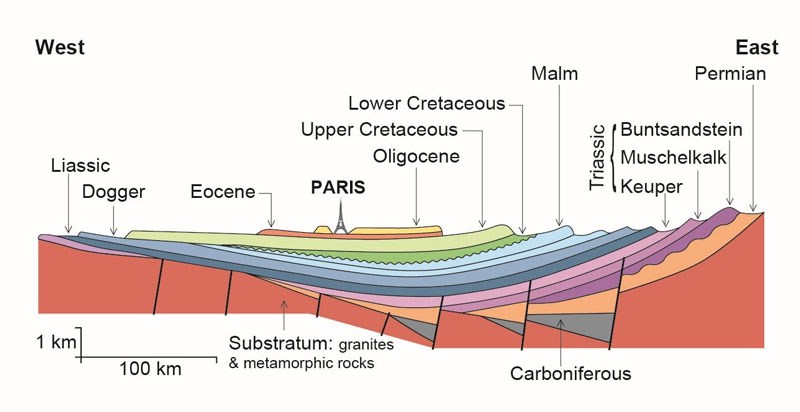 The sediments of the Paris intracratonic, oval or “saucer-shaped” basin, start with units of the Carboniferous and Permian (the Sarre-Lorraine basin). They become younger from the Mesozoic outcrops at the edges to Tertiary/Pleistocene strata approximately at the level of the city of Paris, in the Île-de-France region (the Island of France). The maximum thickness of 9,800-11,500 feet is found in the depocenter in the Brie area.
