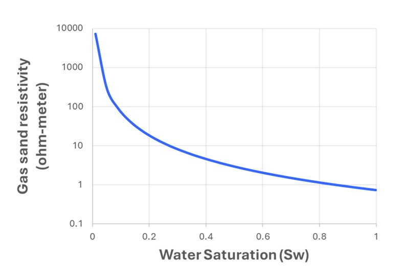 Figure 3. Resistivity of a gas sand decreases with water saturation. In log-log scale this decrease is linear. Resistivities estimated from CSEM can be a useful complement to seismic information for the estimation of water saturation.