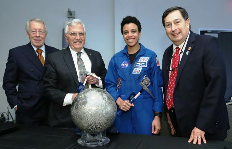 Four geoscientists: one who walked on the moon, one who will, and two who bought telescopes (left to right, Jeff Lund, Harrison “Jack” Schmitt, Jessica Watkins, Charles Sternbach at GeoGulf23).