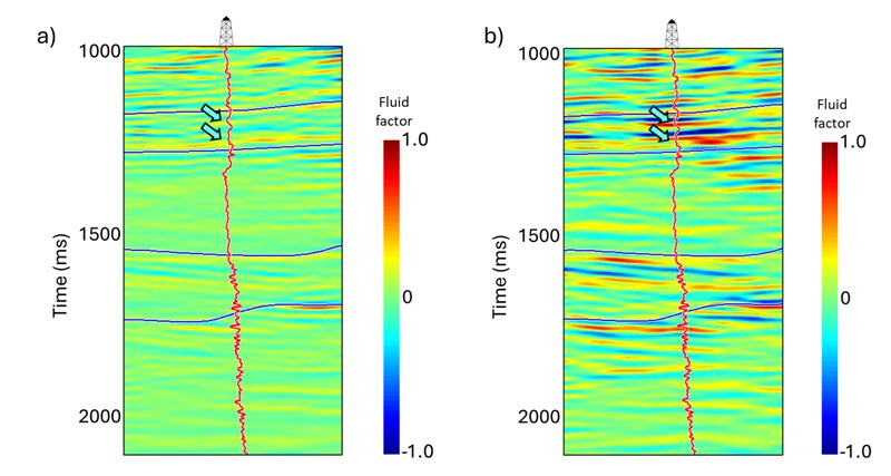 Figure 2: Fluid factor section along a crossline passing through the well, where it is computed by (a) using the conditioned data as such, and (b) minimizing the impact of converted waves brought about by restricting the maximum angle used in analysis. The P-velocity curve in red is shown overlaid on both displays. The expected anomalies for the two sands are missing at the location of the two cyan block arrows in (a), while they are seen at that location clearly.