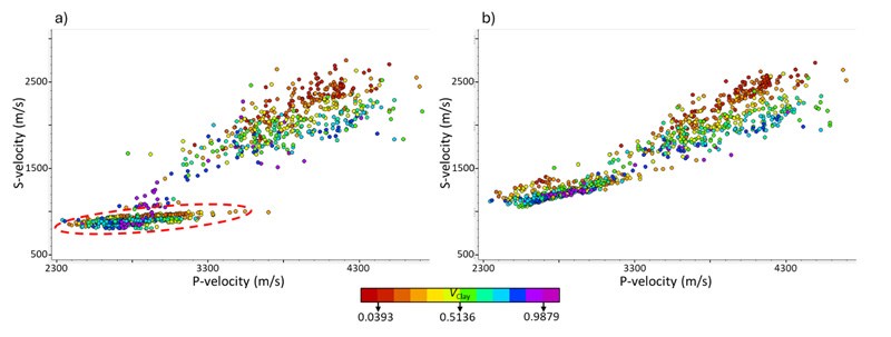 Figure 3: Crossplot for P-velocity versus S-velocity (a) before, and (b) after correction, color-coded with volume of clay. The cluster points highlighted in the dashed red ellipse appear to be erroneous, but after correction do not appear unreasonable.