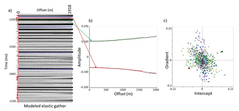 After correcting the well log data for sonic and shear measurements, an elastic gather (forward model) was created to assess amplitude variations with offset at the target levels. Figure 4a illustrates the modeled elastic gather with only primary reflections, while figure 4b displays the amplitude variation as a function of offset for two reflective events (marked in red and green on the elastic gather), which represent the top and base of the gas sand. A Class III AVO response is evident at the interface between shale and gas-charged sand (red event), with a contrasting response for the blue event. The crossplot of intercept and gradient for the data, depicted in figure 4c, shows a red square in the third quadrant and a blue square in the first quadrant, indicating a Class III anomaly. However, this anomaly was not present in the actual seismic data, as previously indicated in figure 2a.