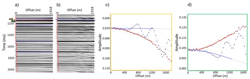 The AVO trends for two seismic events, indicated by the trough and peak with pale yellow and green arrows, are shown in figures 5c and 5d. The red and blue lines represent the best fit lines for synthetic data generated with only primary events and with both primary events and converted waves, respectively. These displays suggest that converted waves can introduce a sinusoidal or wobbly pattern in amplitude, which may alter the AVO gradient and, consequently, the interpretation of derived DHI volumes. Upon analyzing the AVO trend of real seismic data across various seismic events and locations, a sinusoidal amplitude pattern was observed, as depicted in figure 6. This pattern, also seen on the elastic gathers, suggests potential contamination of real seismic data with converted waves, necessitating extra caution during AVO anomaly interpretation.