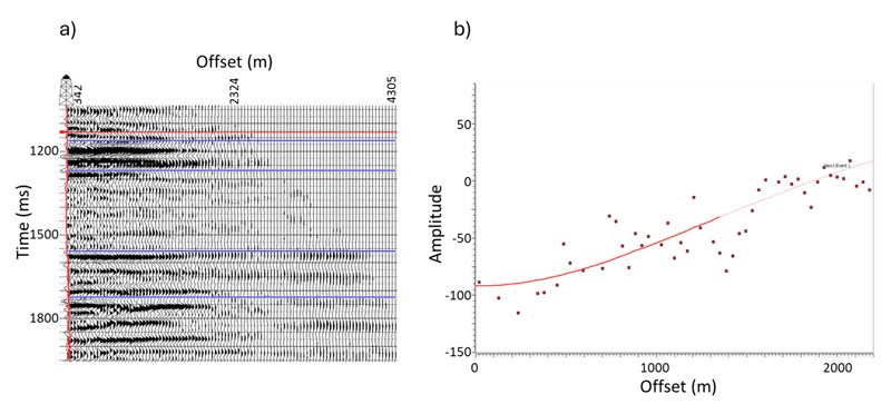 Figure 6: AVO trend analysis shown for real seismic data. For the reflection event in red shown on the seismic gather in (a) a sinusoidal pattern is noticed on the plot in (b) which suggests that the real data are probably contaminated with converted waves.