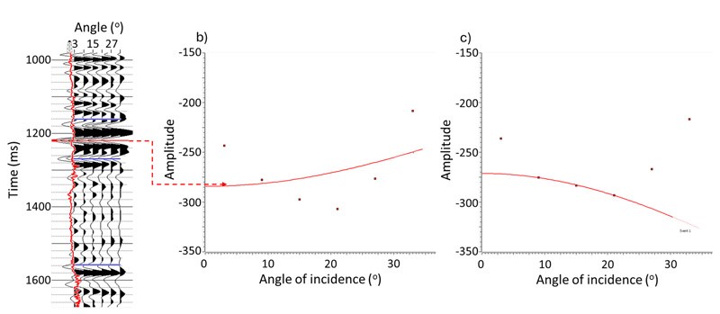 Figure 7: AVO trend analysis on real seismic data. (a) Angle gather at the location of the well. (b) Amplitude variation as a function of angle of incidence when the maximum angle of incidence is (b) 36 degrees, and (c) 30 degrees. Class III AVO anomaly is seen when the maximum angle of incidence of 30 degrees is used in curve fitting analysis.