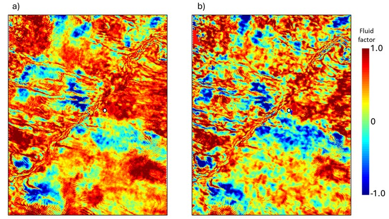 Figure 8: Horizon slice from fluid-factor volume computed when converted waves impact was (a) not minimized, and (b) was minimized by restricting the maximum angle (up to 30 degrees) used in analysis over a 10-millisecond window. The location of the well shown in previous displays is also indicated on both displays.