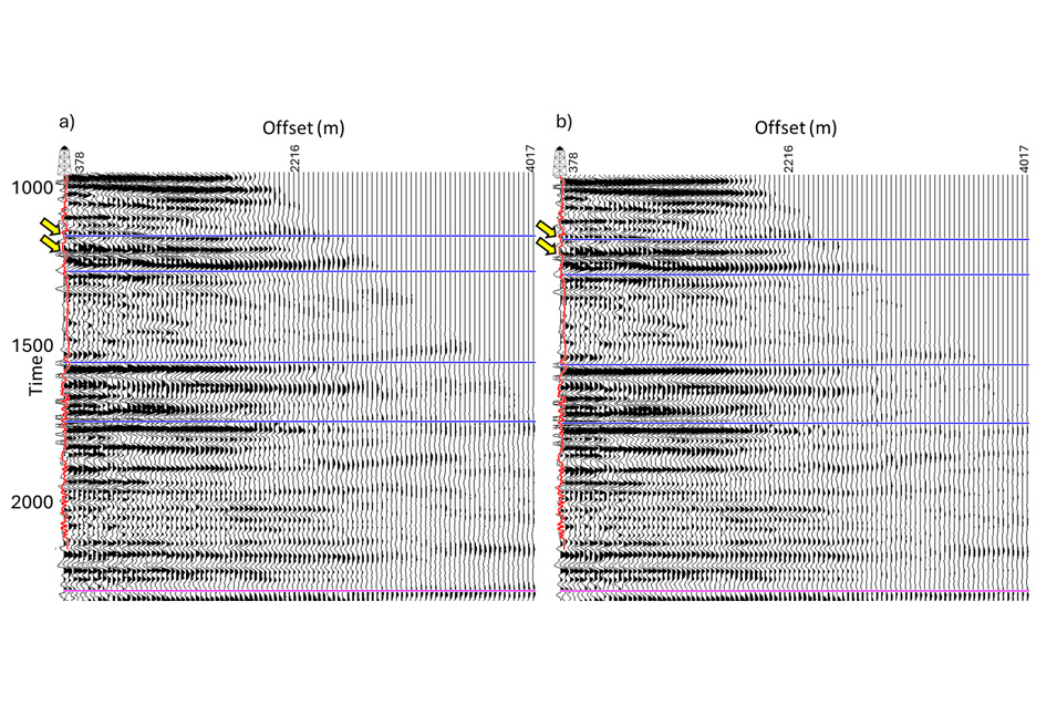 In addition to the pre-stack seismic data, well logs for some wells were also available. These logs could be utilized to identify the anomalous zones through AVO analysis and impedance inversion. Such analyses typically commence with the preconditioning of seismic gathers to improve the signal-to-noise ratio. Figure 1 illustrates a comparison of several input and conditioned gathers near one of the wells. After conditioning, as shown in figure 1b, there is a noticeable reduction in high-frequency noise and enhanced alignment of reflection events. The well depicted, superimposed on the section in figure 1, revealed a substantially thick gas-bearing layer at the depth marked by the lower yellow block arrow, with a thinner gas sand layer above it. Consequently, conducting AVO analysis is of interest not only to verify the presence or absence of gas in the available wells but also to identify other areas within the 3D seismic volume where gas presence might be detected.