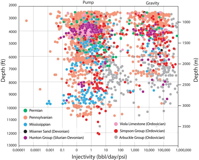The underpressure formations, widely present in the state, offer a unique reservoir type for CO2 storage. These units have lower pore pressure than hydrostatic (standing freshwater columns) and are generally perceived as compartments isolated by sealing rocks. In Oklahoma, the early Ordovician Arbuckle formation is an archetype. Routinely used for wastewater disposal, the Arbuckle operates under gravity flow in many parts of the state. Figure 1b shows the distribution of Class II commercial disposal wells (both enhanced oil recovery and wastewater), and figure 3 is a compilation of their injectivities. The reader will note that in figure 3, in addition to the Arbuckle Group, several other units in the stratigraphic column exhibit sub-hydrostatic pore pressure (cluster labeled gravity; figure 3). Injection into underpressure units may alleviate leakage concerns.