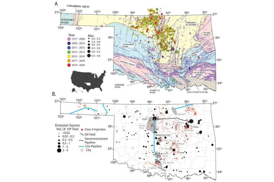 The oldest structures in Oklahoma are associated with a Precambrian rift-related transform system, an approximately 1,200-mile-long failed rift in the center of North America, with least 20,000 feet of detrital clastics, basic sills and basalt flows. This feature is mostly interpreted from gravity anomalies and does not directly manifest in the morphology of the state’s basins, although it is likely to have influenced their later orogenic evolution. Most recent structures, including several giant oilfields, are from Early Pennsylvanian orogeny. Controversy remains on the sealing nature of the faults associated with these large structures. While oilfields such as Oklahoma City and Deep Crescent are fault-bounded favoring their sealing ability, the earthquakes that started in 2008 indicate a level of risk. The seismicity trend, likely from the reactivation of deep basement faults, correlates to high-volume, high-pressure injection in the early Ordovician Arbuckle Group. Like boreholes, we recommend avoiding known faults regardless of their present-day orientation. We have limited our discussion in this article to stratigraphy younger than Arbuckle because, although experience from wastewater injection shows ample storage, open questions surrounding the risks of containment and induced seismicity remain.