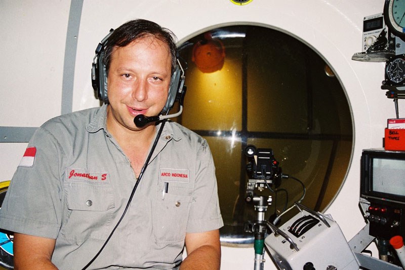 The author exploring the Bintuni Bay seafloor in 1995 by submersible in search of seabed oil seeps and gas chimneys in Oceaneering’s manned submersible vehicle, launched from the deck of the Deep Sea Ice drillship (Salo, 1995).