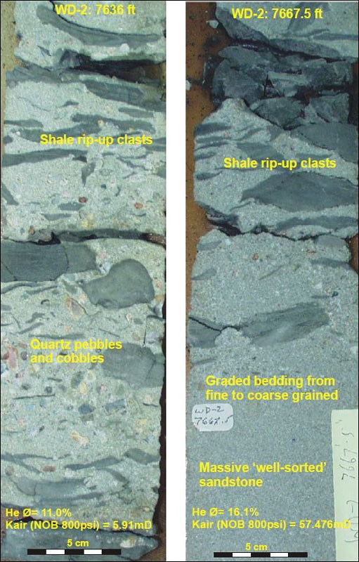 After drilling 650 feet of additional Palaeocene shale, WD-2 took a 2021-unit gas kick. Mud weight was increased to 10.8 pounds per gallon, and three 30-foot cores were cut in separate gas-bearing Paleocene sandstones each associated with high gas. But at 7,624 feet, a pronounced drilling break occurred indicating unusually porous lithology. I chose a 60-foot core-barrel to be run in the hole this time, and with a 1,440-unit background gas reading, cut WD-2’s first sandstone core. Upon recovery, I was surprised to see graded bedding of fine to medium to coarse sandstone, followed by conglomerate. Another 60-foot core-barrel was run in hole, with additional graded-bedding intervals containing shale rip-up clasts recovered after coring, so I asked for yet another 60-foot core-barrel.