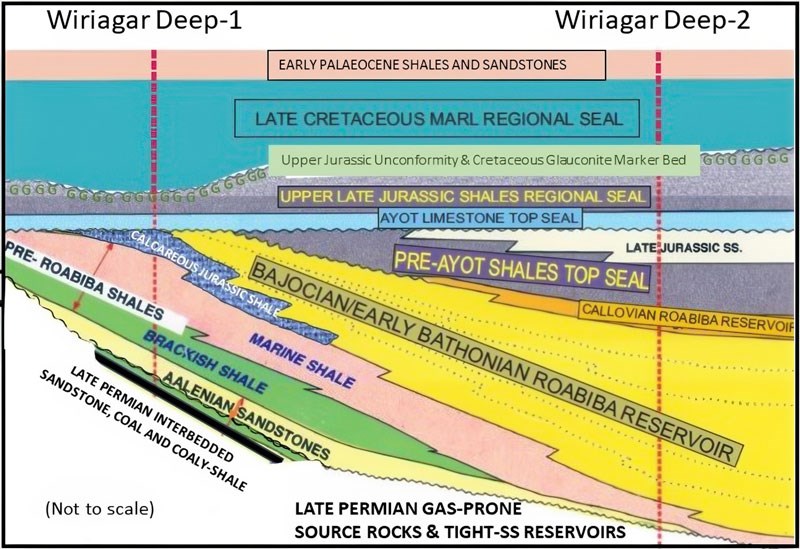 Conceptual schematic of Wiriagar Deep’s Mesozoic sequence stratigraphy and the lithological relationship between WD-1 and WD-2 boreholes (diagram not to scale horizontally or vertically). Note that younger Callovian, and Bathonian-Bajocian sandstones either onlap or are eroded out at the WD-1 location, where only the Aalenian sandstone reservoir was present (modified from Salo thesis, 2004).