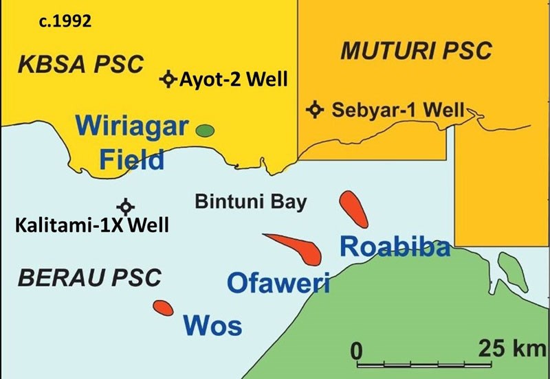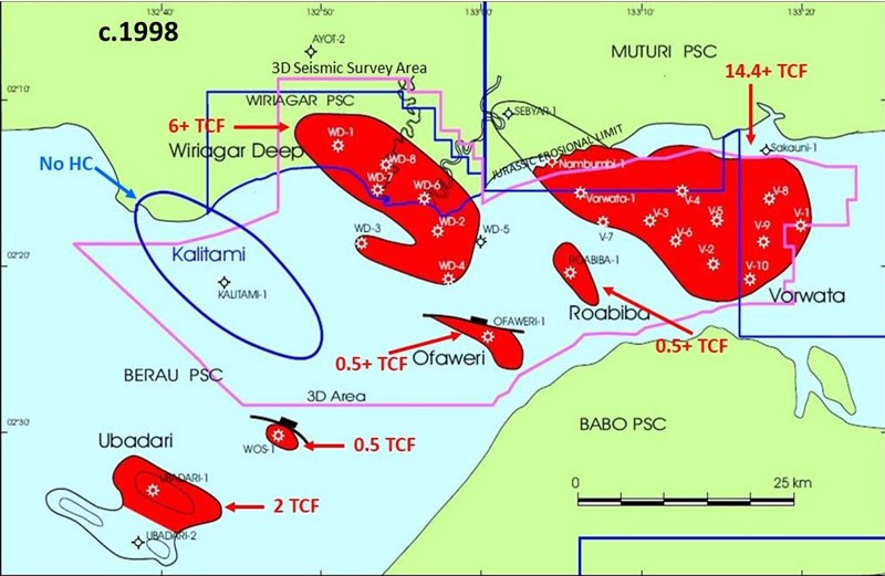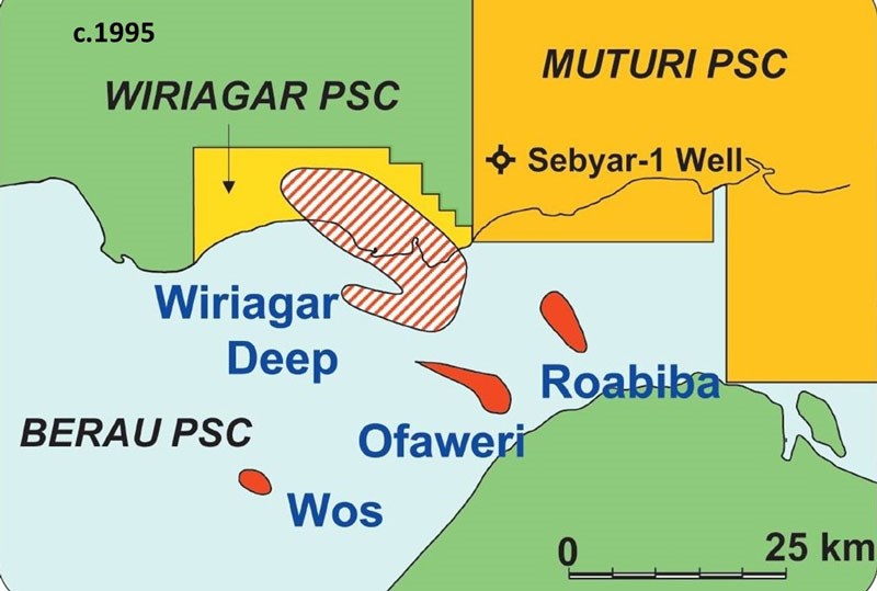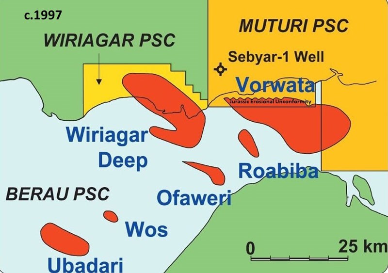 ARII obtained Wiriagar PSC in 1993 and discovered and confirmed the Wiriagar Deep Jurassic gas reservoir only in 1994 and 1995, with only the WD-1 well drilled at the crest and the WD-2 well drilled at the midpoint of the gas reservoir. The giant WD Jurassic gas field was not yet fully delineated and appraised; therefore, it is shown with red stripes for the suspected gas field location on the circa-1995 map.