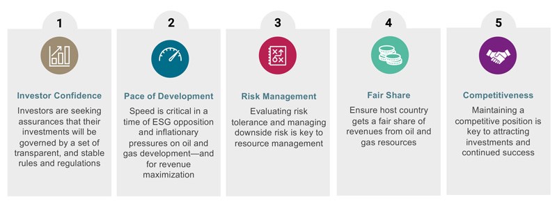 Key factors shaping country’s E&P competitiveness. Five Factors: Guiding principles for success and value maximization. In order to succeed, countries need to balance revenue maximization with reduced risk and adequate competitiveness