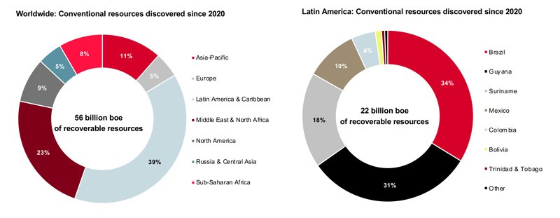 Nearly 40 percent of global discoveries between 2020 and 2023 occurred in Latin America and Caribbean countries. Data compiled Jan, 2, 2024. “Other” accounts for discoveries in Argentina, Chile, Cuba and Ecuador. Image provided by S&P Global Commodity Insights.
