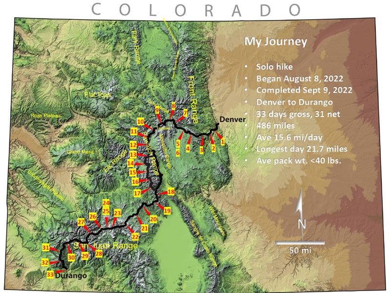 The author’s Colorado Trail thru-hike journey map. Modified from Colorado Trail Foundation CT Topographical map at ColoradoTrail.org/trail/