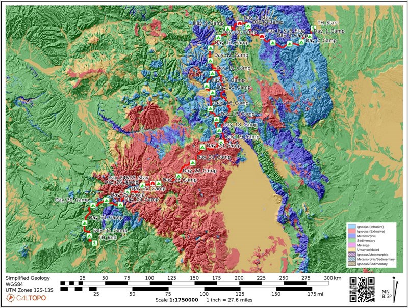 Generalized geologic map of Colorado Trail showing each of my campsites and off-trail stays. Map generated from CalTopo.com, reproduced with permission. OpenStreetMap data is made available through the Open Database License www.openstreetmap.org/copyright